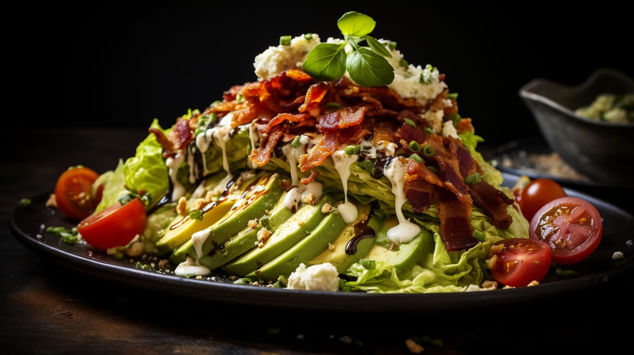Our beloved Wedge Salad emerged during the early 20th century, though its exact origins remain a bit fuzzy (much like the edges of a well-aged blue cheese). It initially made waves during the 1910s and 1920s, becoming a diner staple and a symbol of American gastronomy. Its essence lies in its simplicity: a wedge of iceberg lettuce drizzled with blue cheese dressing, and often adorned with tomatoes, crispy bacon, and chives.